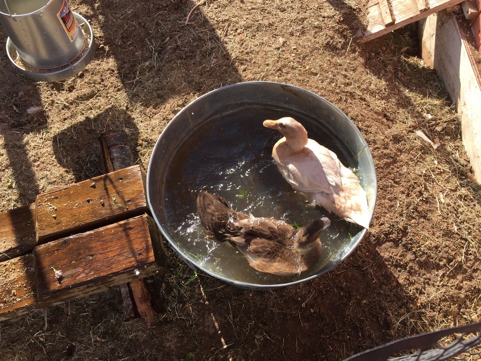 The Pekin ducklings were already 8-9 ounces when we weighed them, and the other three ducklings were 3-4 ounces. One week later they had already doubled in size. We moved the Pekins into a larger tub, but they kept trying to get to the little ducklings. One Pekin tumbled into the terrarium, and we were worried they would hurt themselves.